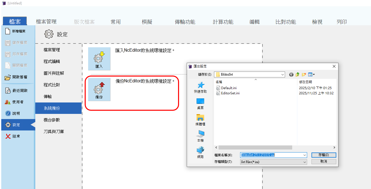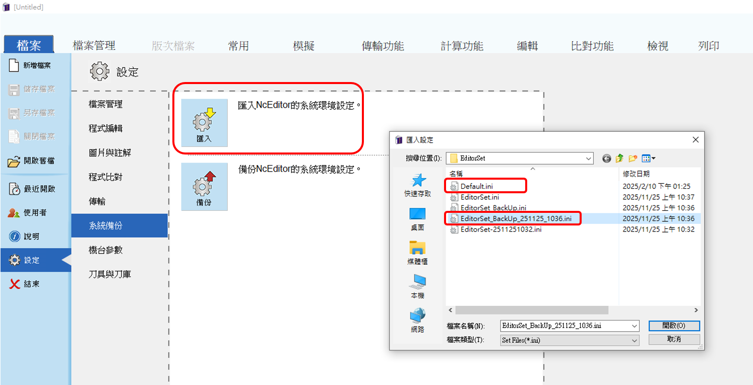 2024版之後會自動備份,選取備份檔EditorSet_BackUp_251125_1036.ini匯入